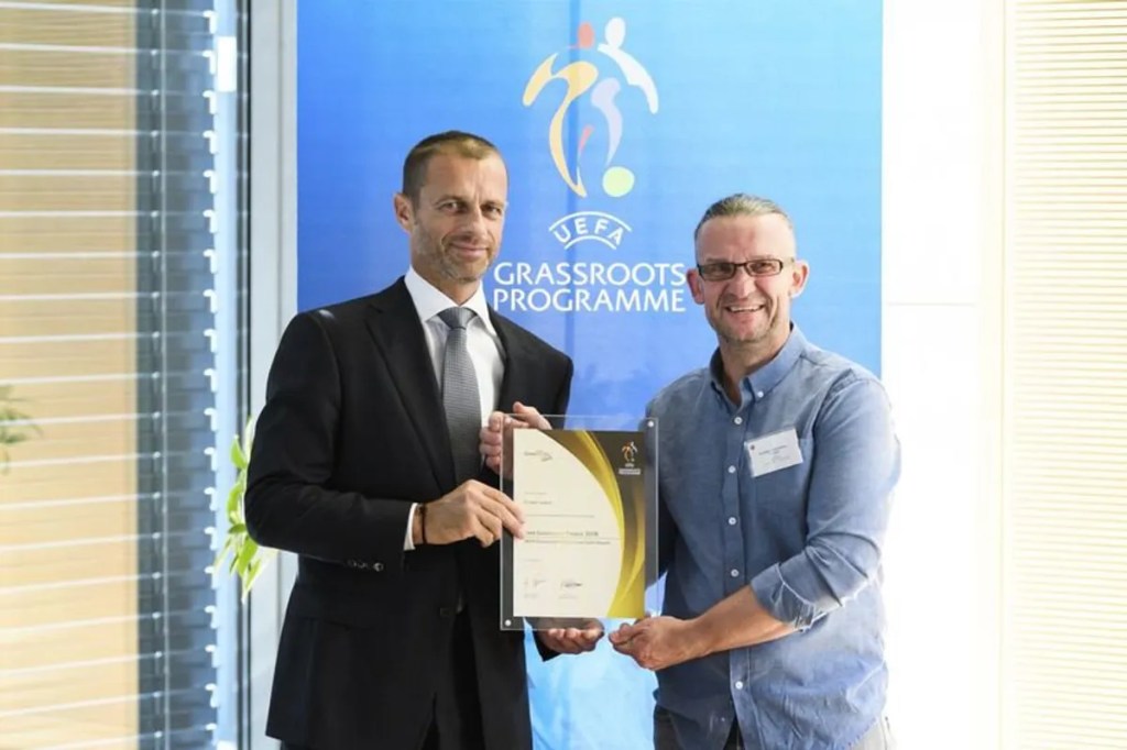 Árið 2018 hlaut FC Sækó Gullverðlaun UEFA (Grassroots Award) fyrir framúrskarandi grasrótarstarf. Á myndinni sést þáverandi forseti UEFA Aleksander Čeferin veita Bergþór Grétar Böðvarsson formanni FC Sækó verðlaunin.